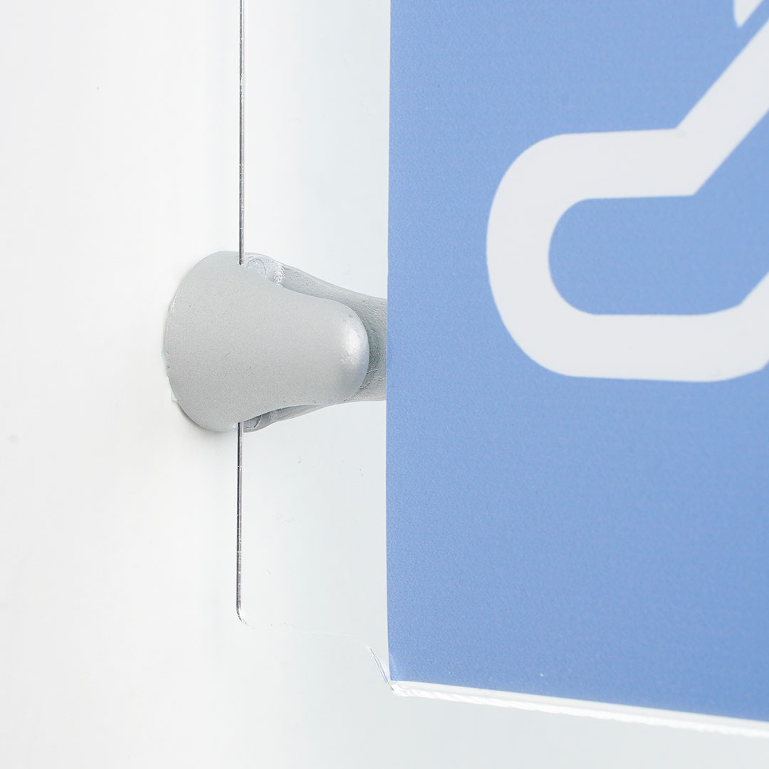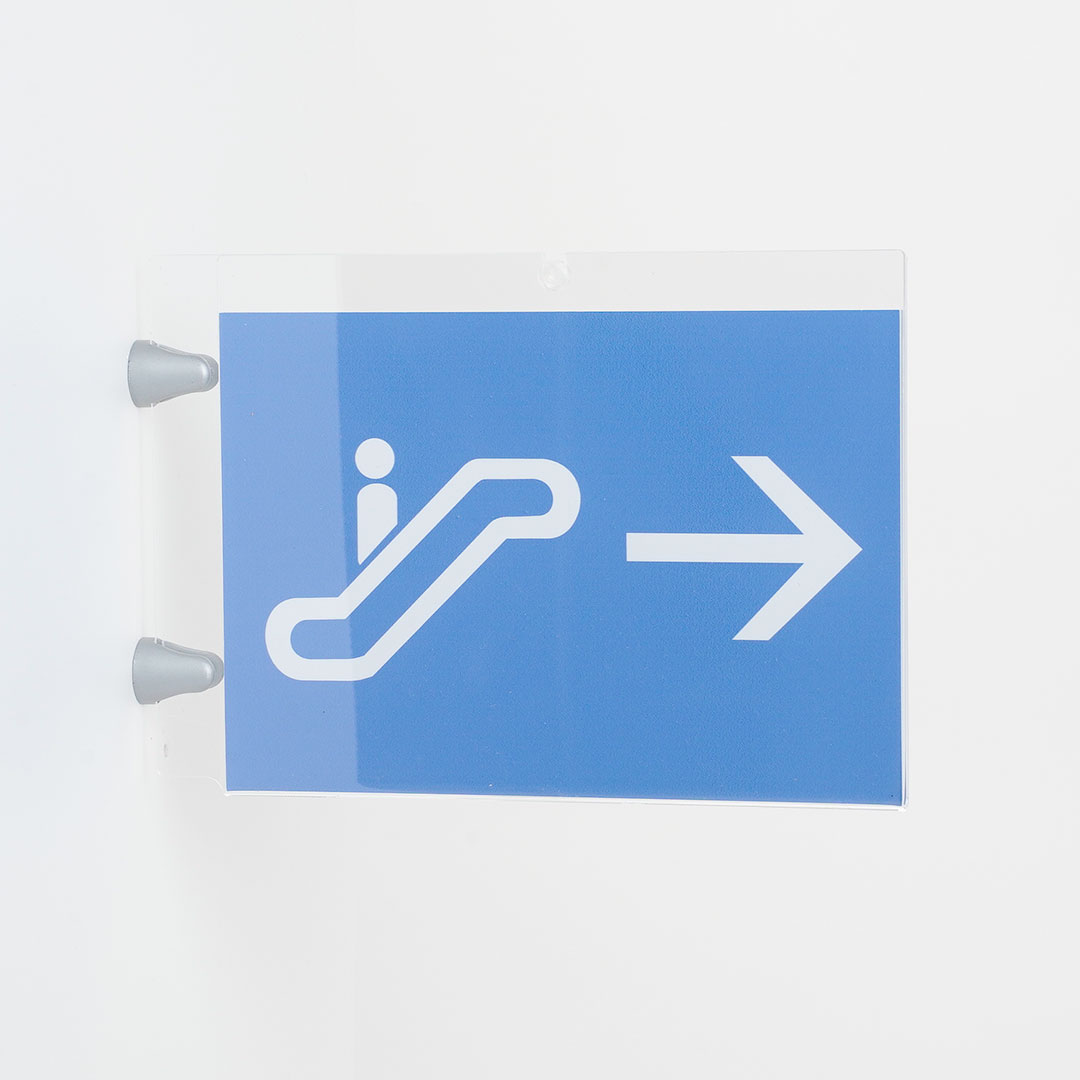 Sistema di segnaletica a bandiera:- tasca in plexiglass trasparente piegata ad U;- aletta laterale per il fissaggio a parete con distanziale;- clip di chiusura trasparente;- per grafiche intercambiabili.