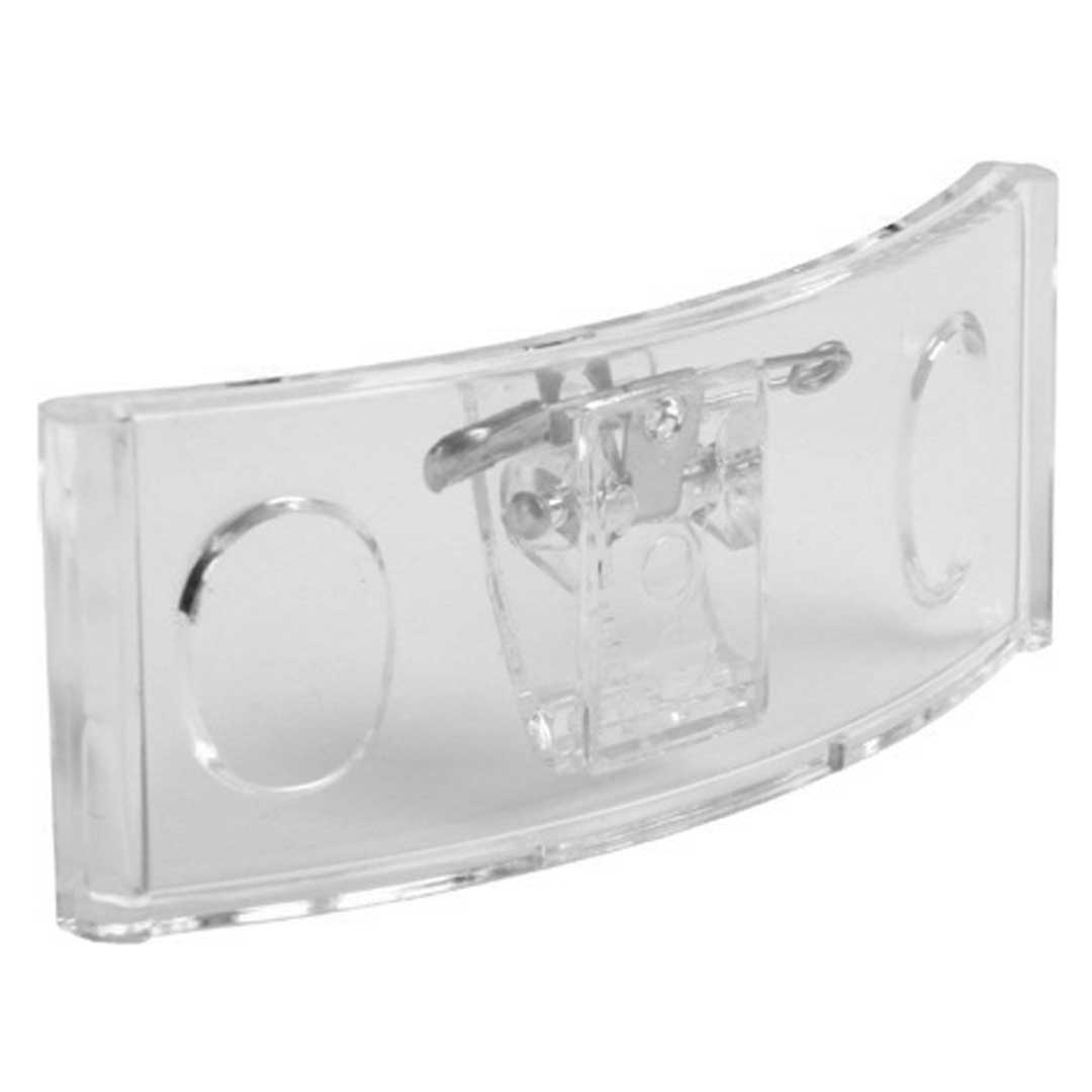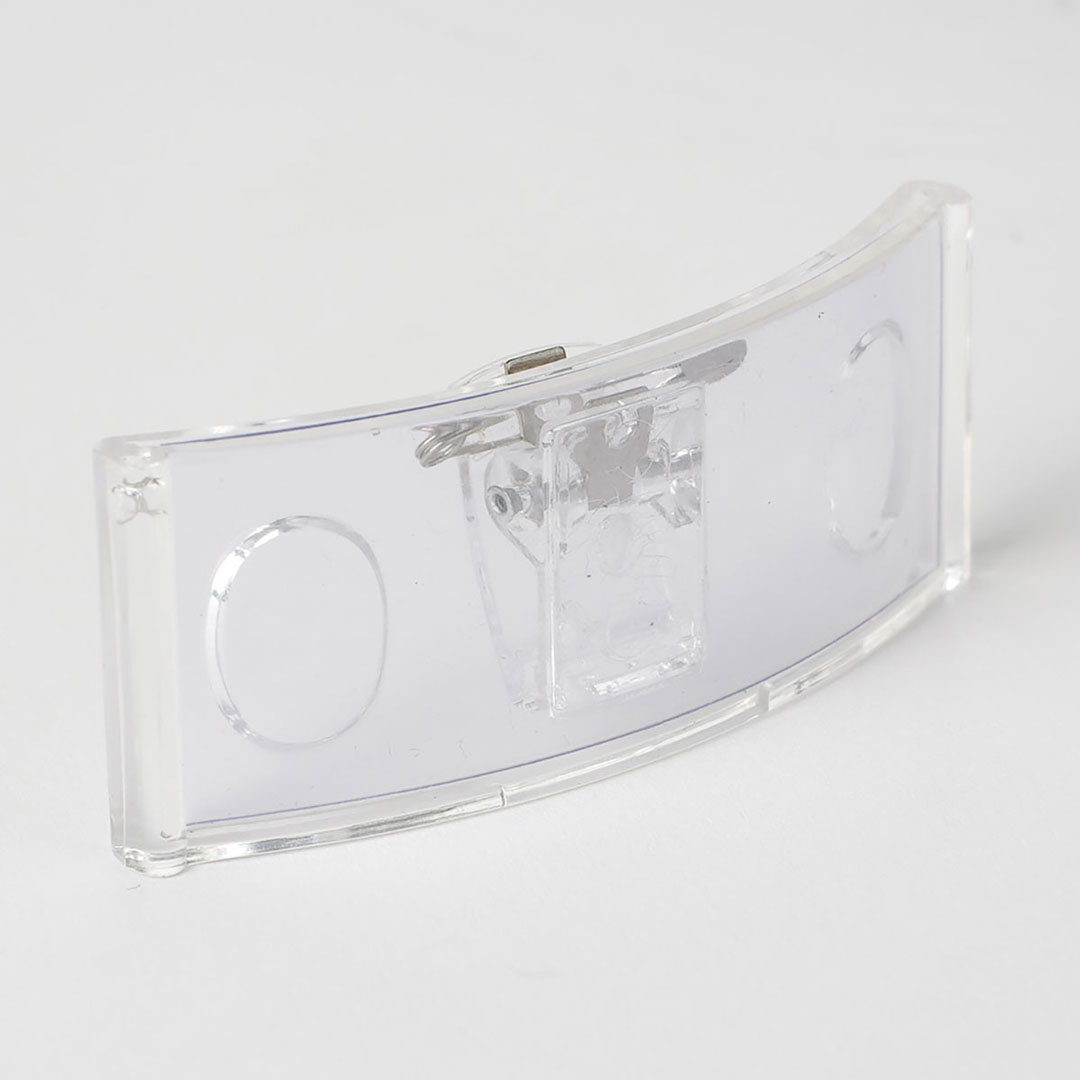 Porta badge curvo in plexi con aggancio a molla. Dimensioni 80×32 mm.