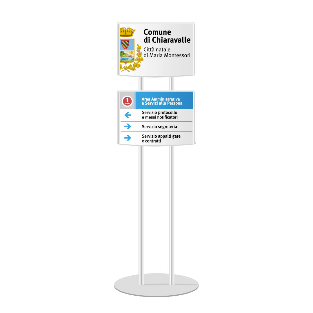 Minitotem:- a due montanti;- dimensioni Ø 35×140 cm;- 2 targhe bifacciali;- con profili in alluminio estruso;- superficie convessa in forex per interni-in lamiera per esterni;- formato utile A3 cm orizzontale.