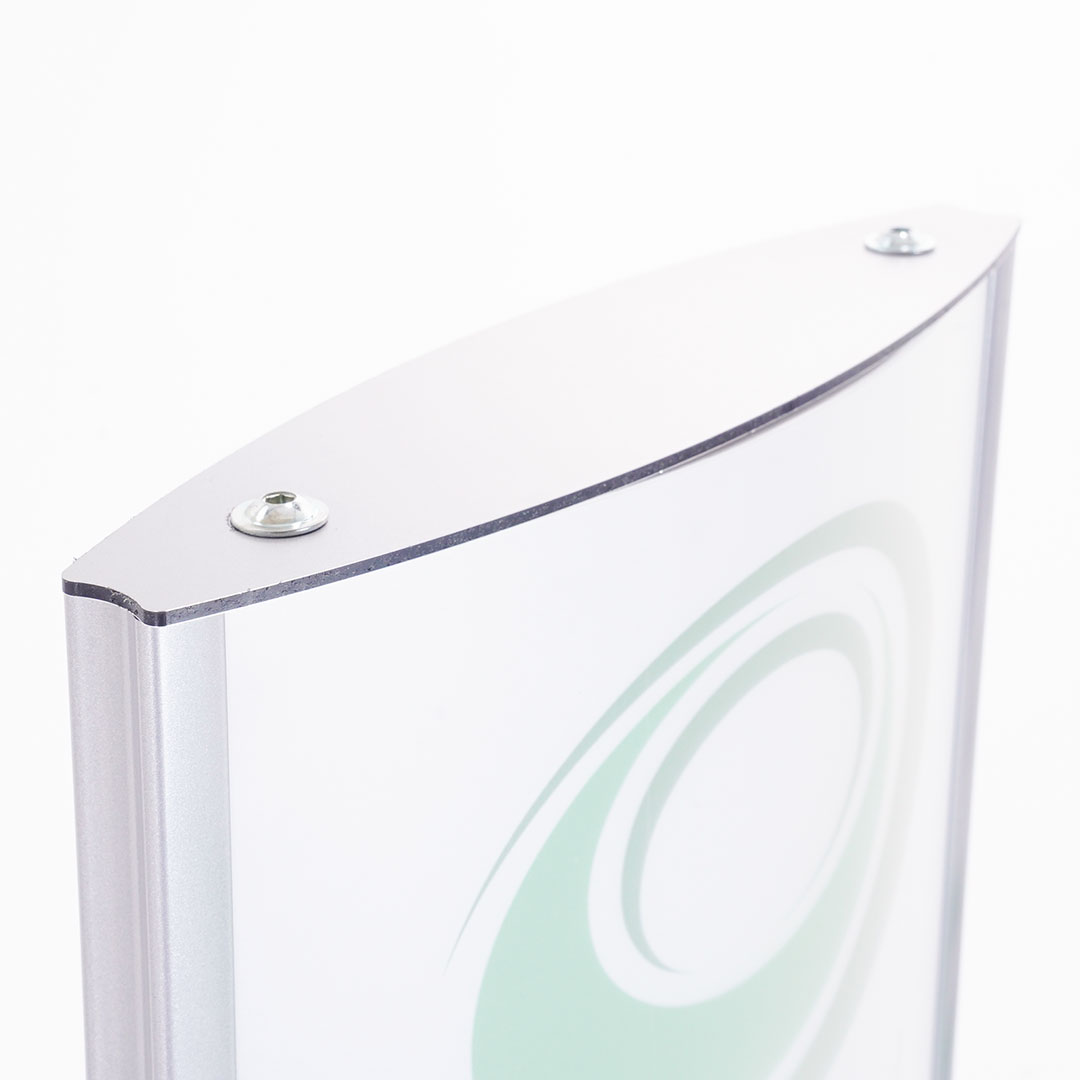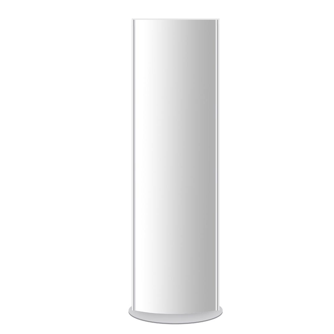 Minitotem:- con profili in alluminio estruso;- dimensioni Ø 35×140 cm;- targa bifacciale;- superficie convessa in forex per interni-in lamiera per esterni;- formato utile 42×140 cm verticale.