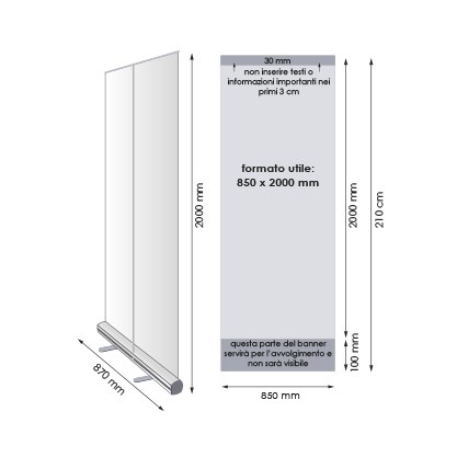 Porta Banner roll up:- due larghezze disponibili: 85 o 100 cm;- altezza 200 cm;- sistema meccanico retrattile;- piedini e palo di sostegno;- banner riavvolgibile;- monofacciale;- servizio stampa interno preventivabile;- borsa per il trasporto inclusa.