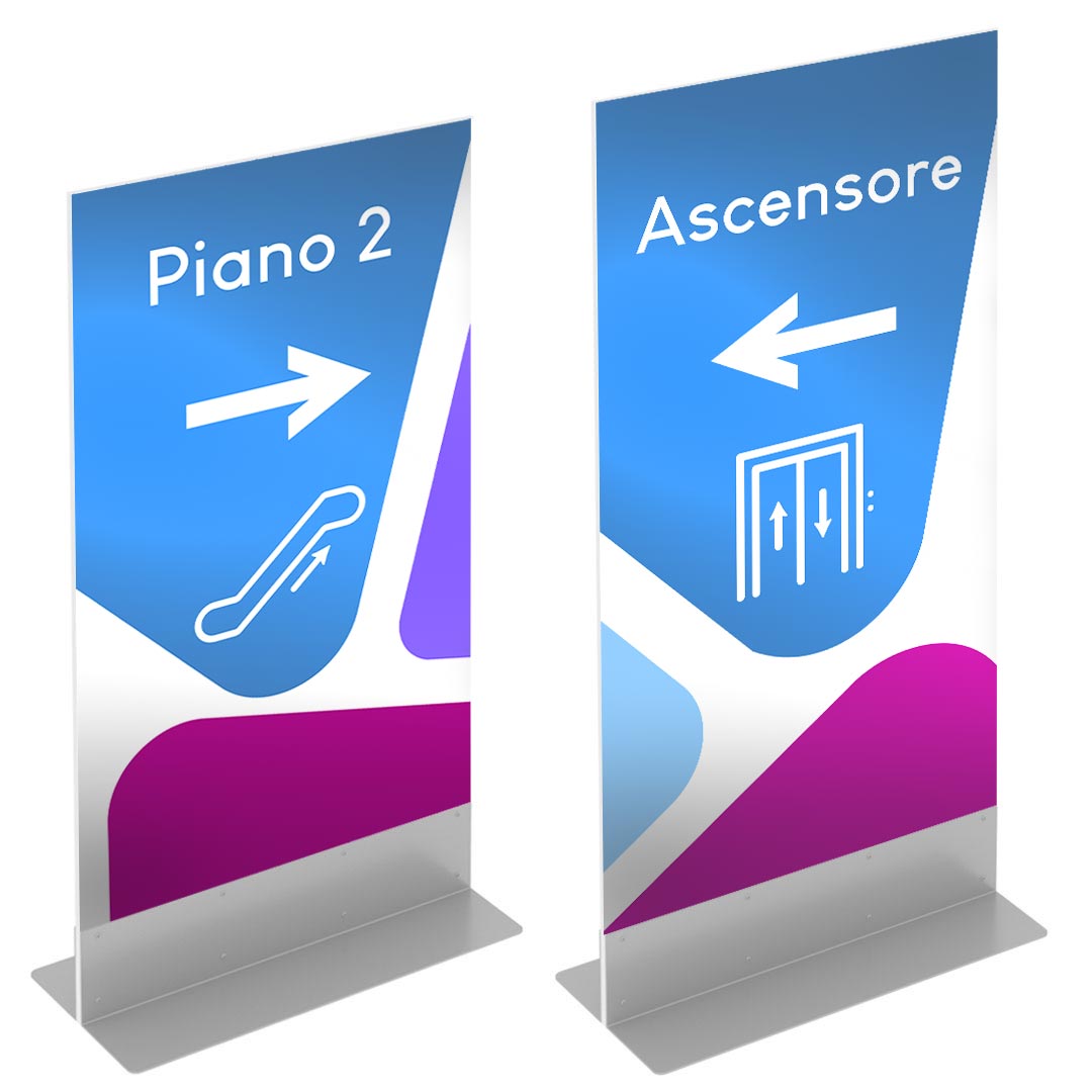 Totem linea SLIM:- base a T in metallo verniciato colore silver;- larghezza base 1000 mm;- pannello in sandwich, sp. 19 mm;- personalizzabile con grafica in vinile adesivo;- due altezze disponibili.