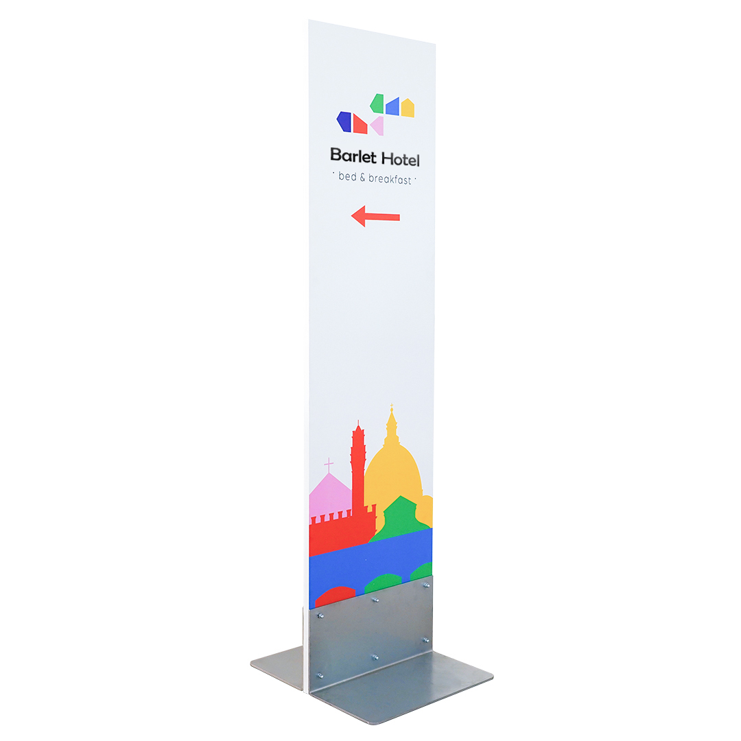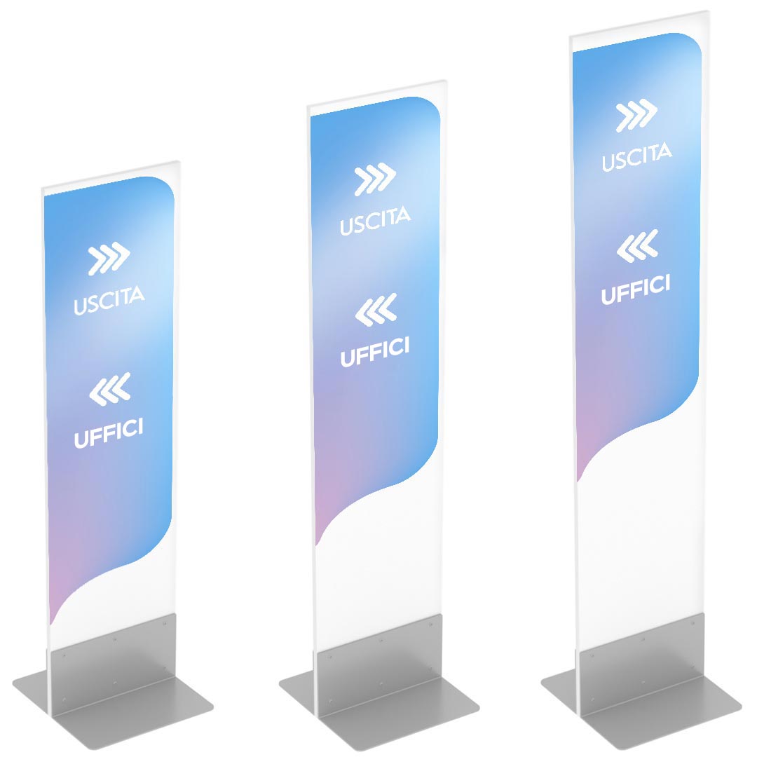 Totem linea SLIM:- base a T in metallo verniciato colore silver;- larghezza base 42 cm;- pannello in sandwich, sp. 19 mm;- personalizzabile con grafica in vinile adesivo;- tre altezze disponibili.