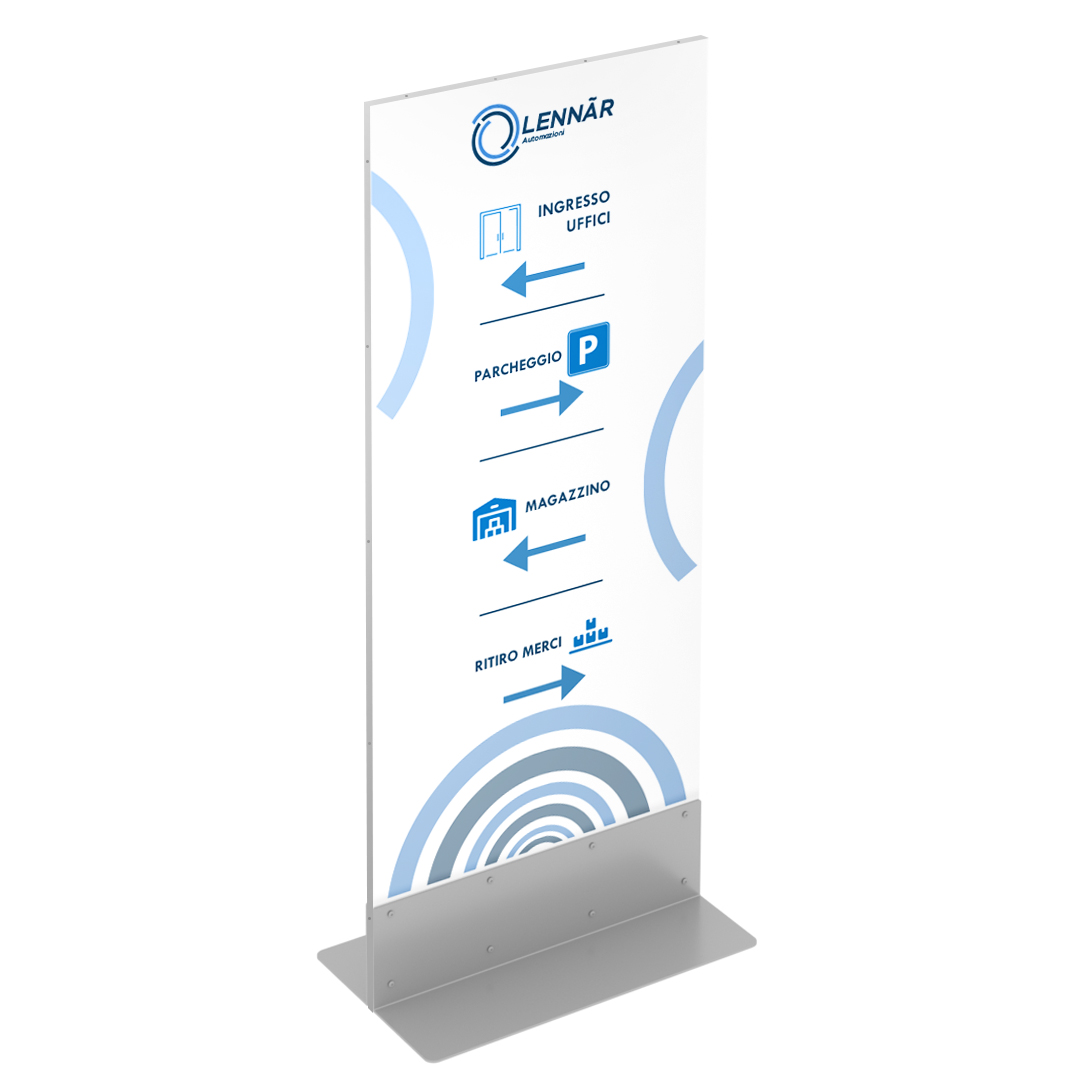 Totem linea SLIM:- base a T in metallo verniciato colore silver;- larghezza base 75,5 cm;- pannello in forex, sp. 19 mm;- profilo perimetrale in alluminio;- personalizzabile con grafica in vinile adesivo;- due altezze disponibili.